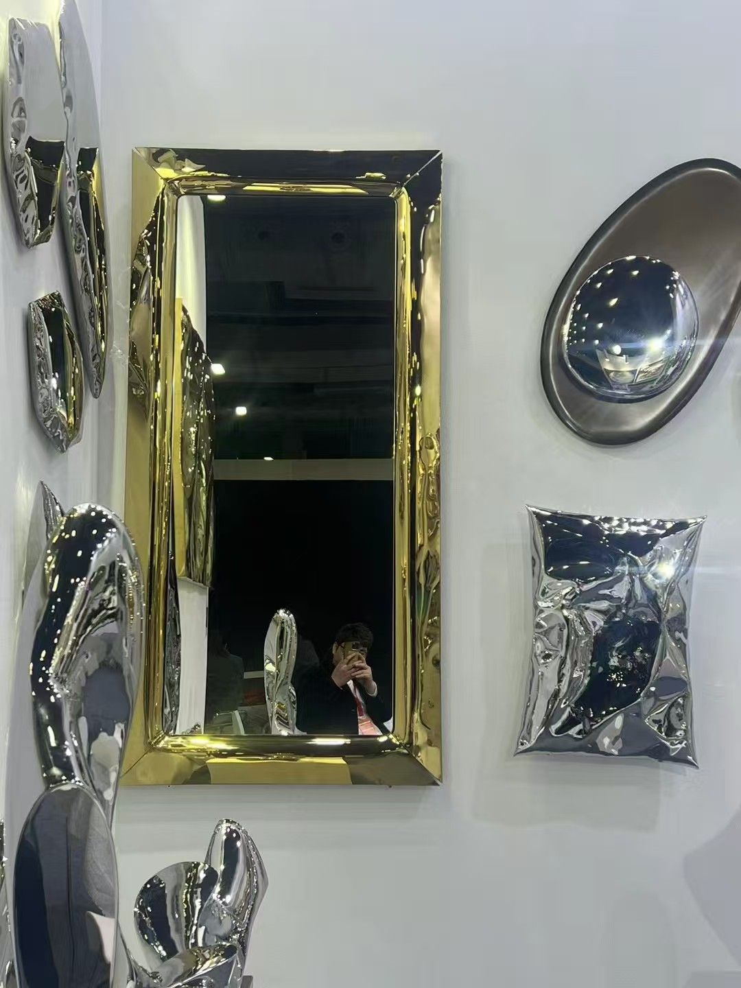 Designed for residential and commercial spaces, this statement mirror can be fully customized according to client requirements. Custom options include dimensions, hammered patterns, surface textures, colors, and the outer contour shape of the frame. Whether for luxury homes, hotels, showrooms, or galleries, this stainless steel mirror provides a distinctive and elegant visual impact that elevates any environment.