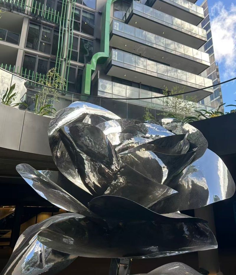 Stainless Steel Mirror-Finished Rose Sculpture Installed in Melbourne Community Garden